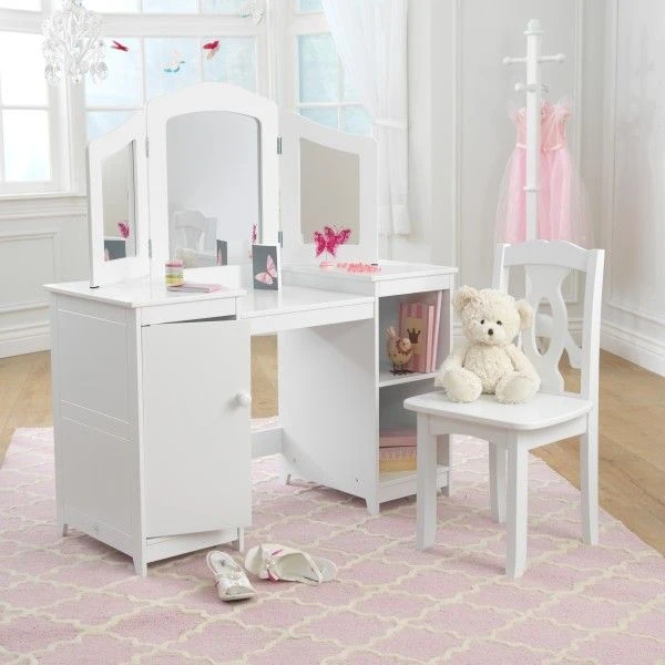Chaise blanche assortie qui se glisse facilement sous la coiffeuse.